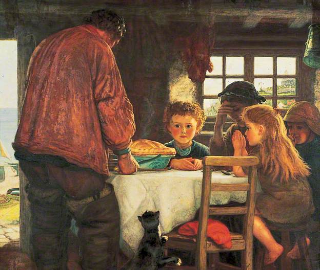 The painting above by British artist, Arthur Hughes and was painted in 1881. It is called “Saying Grace, The Skipper and His Crew.”
