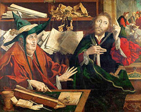 We’ll close with a painting by Marinus van Reymerswaele from 1540 back when “witch hats” were fashionable all year round. Once again you have all three elements. The happy debtors. The satisfied merchant and the shrewd manager who is still trying to explain himself even after the rich man has commended him. “It’s all right,” the rich man is saying. “I’ve got most of my money back. The people think well of me. They really like you. Go on your way and be happy. I won’t worry about you. You’ll be fine.”