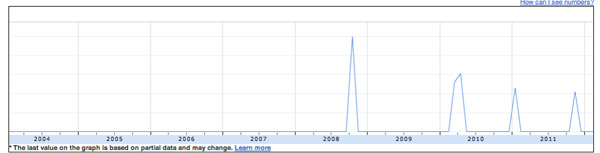 Then we plugged in “multicultural ministry.” This is a topic that the our denomination has announced is a priority. The Google Insights graph revealed a flat line with sharp and short-lived spikes occurring about annually. There is only sporadic interest in this topic!