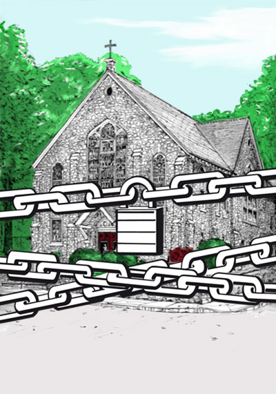 There is a hole in front of Redeemer Church. A small long-present sinkhole seems to have deepened with this year’s rains. It now has police tape around it. It’s right next to the sign forbidding dogs on the property and not far from the locked doors, the windows of which are now covered with cloth, even further alienating the community of East Falls from one of its sacred places.