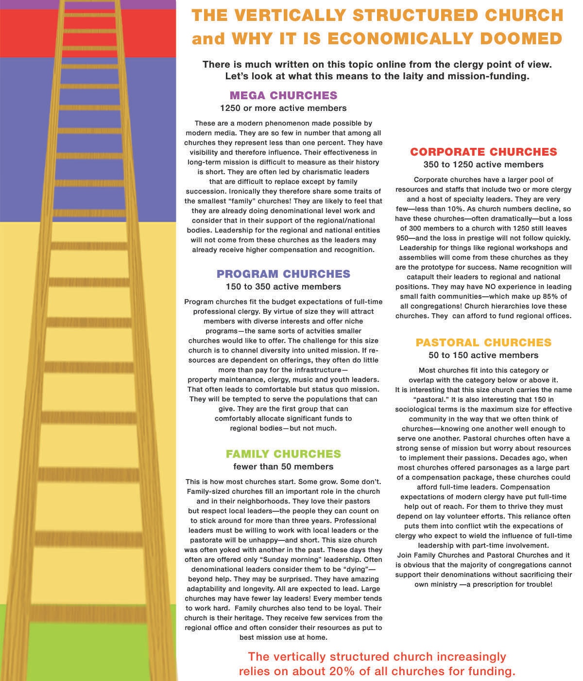 The Vertical Church values big. Big translates economically into more support for centralized services—one of the reasons the Church was structured vertically in the first place. It often ignores the reality that the effectiveness of church mission relies on community, which functions best on a smaller scale—and who today can do a great deal more on their own than they could twenty years ago.